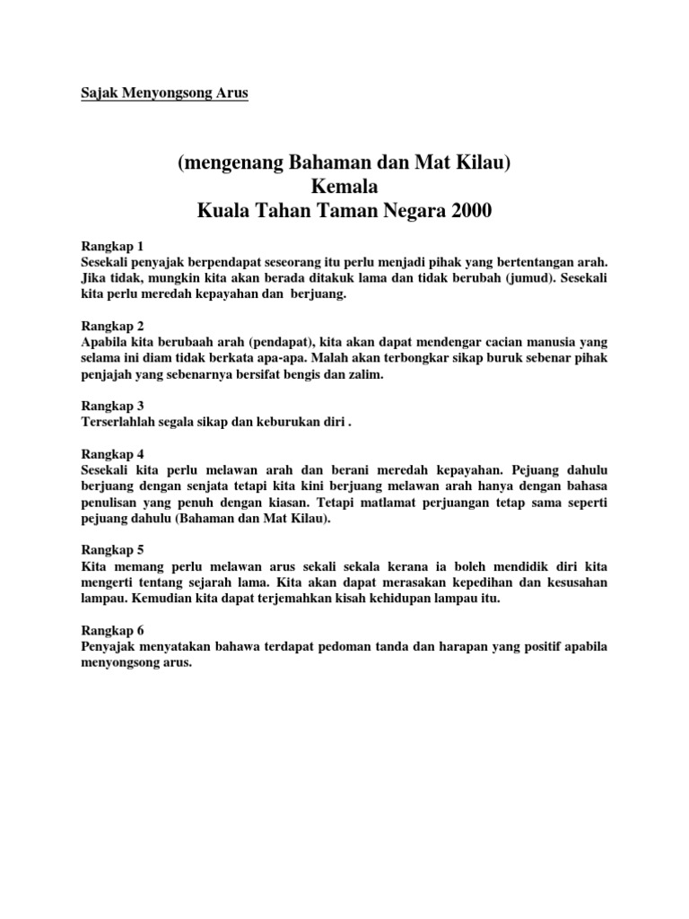 Sajak Menyongsong Arus mengenang Bahaman dan Mat Kilau Kemala Kuala Tahan Taman Negara 2000 Rangkap 1 Sesekali penyajak berpendapat seseorang itu perlu menjadi pihak yang bertentangan arah. Pusat tuisyen PERCUMA pertama di Malaysia yang membawakan kepada anda guru-guru PAKAR dari seluruh negara. Sajak ini dapat memberikan motivasi MENYONGSONG ARUS mengenang BAHAMAN dan MAT KILAU KEMALA Sesekali arus wajar kusongsong kalau tidak aku akan tetap mendap di kuala di hulu sungai ada negeri sejuta tahun beribu pohon belum disentuh sejuta erang cengkerik di liang-liangnya aroma daun dibasahi embun gadis sunti menjabat puyuh di.